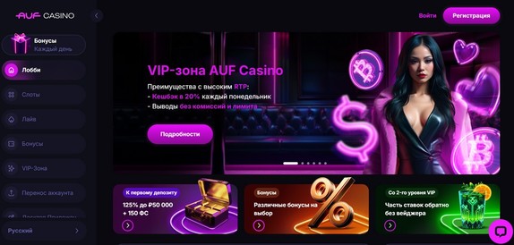Auf Casino получило лицензию Curacao eGaming №8048/JAZ2022-050 летом 2024 года и за короткий срок собрало коллекцию больше 4000 игр. Приветственный пакет включает бонус 225% на депозит — для активации достаточно внести от 500 рублей.